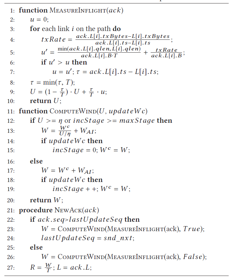 As shown in the algorithm, only three parameters to set. $\eta, maxStage, W_{AI}$. $\eta$ controls the tradeoff between utilization and transient queue length. maxStage controls the tradeoff of steady state stability and the speed to reclaim free bandwidth, usually 5.$W_{AI}$ controls the tradeoff between the maximum number of concurrent flows on a link to keep near-zero queues and the speed of convergence to fairness.
